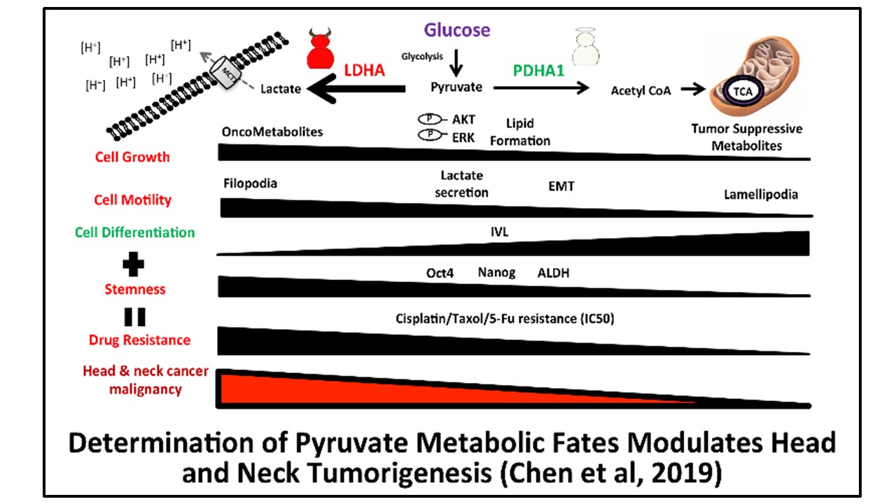 1. 探討頭頸癌細胞中,糖解作用(Glycolysis pathway)、脂質新生(Lipogenesis)、氧化磷酸化(Oxidative Phosphorylation)及胺基酸等代謝途徑調控頭頸癌 細胞癌化特性的細胞及分子機制。以多方面的代謝分析,釐清不同代謝路徑及代謝可塑性(Metabolic plasticity)在癌化過程所扮演的角色。( 右圖)