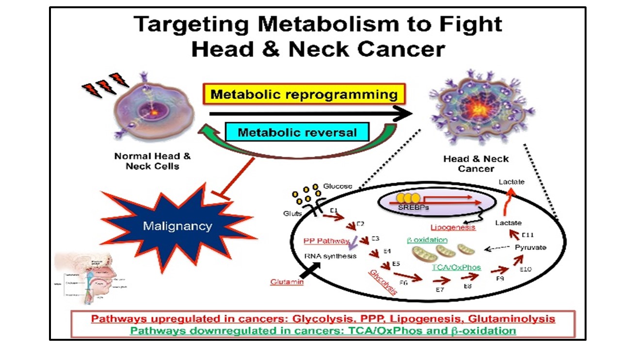 1. 探討頭頸癌細胞中,糖解作用(Glycolysis pathway)、脂質新生(Lipogenesis)、氧化磷酸化(Oxidative Phosphorylation)及胺基酸等代謝途徑調控頭頸癌 細胞癌化特性的細胞及分子機制。以多方面的代謝分析,釐清不同代謝路徑及代謝可塑性(Metabolic plasticity)在癌化過程所扮演的角色。( 右圖)